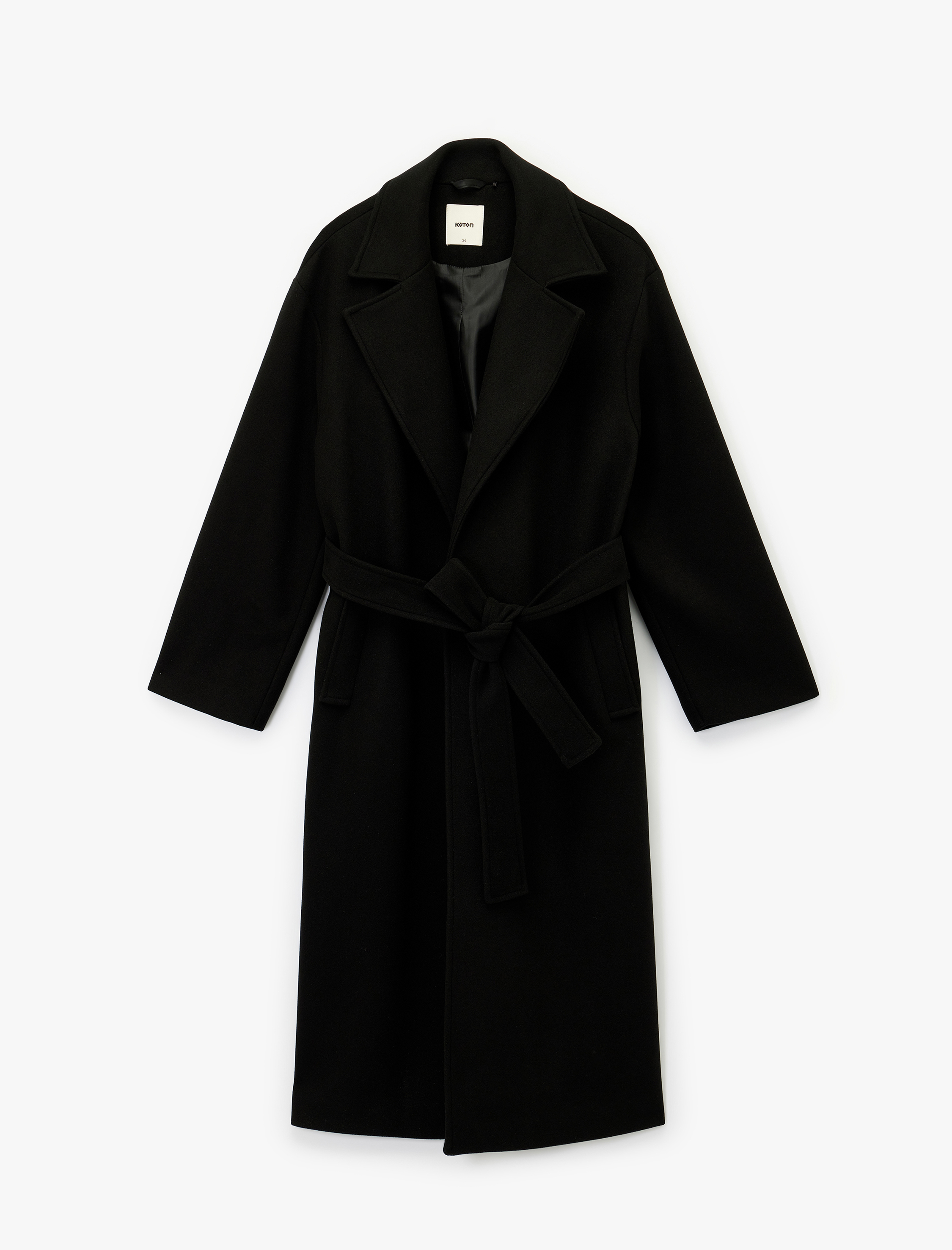 Uzun Kollu Cepli Kemerli Uzun Kaşe Kaban
