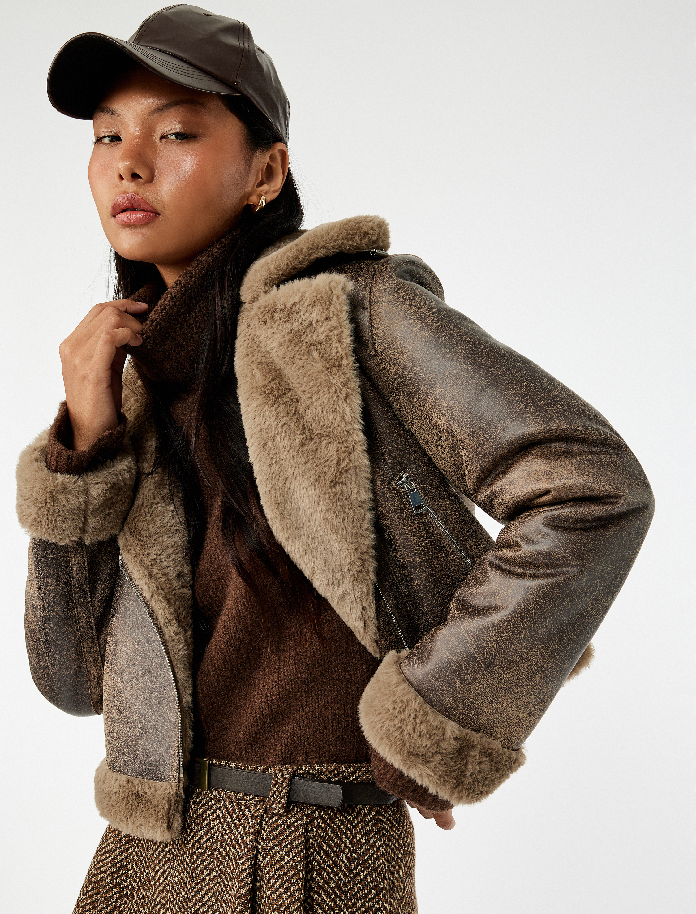 Uzun Kollu Deri Görünümlü Suni Kürk Yaka Biker Ceket
