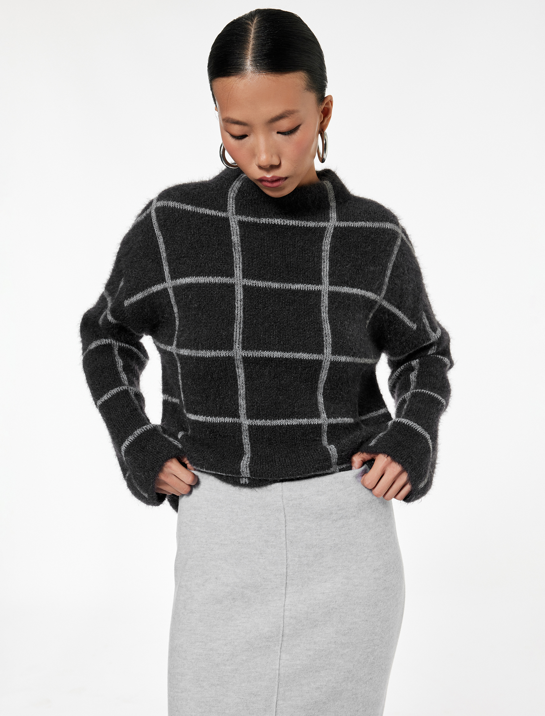 Uzun Kollu Dik Yaka Kareli Triko Peluş Kazak
