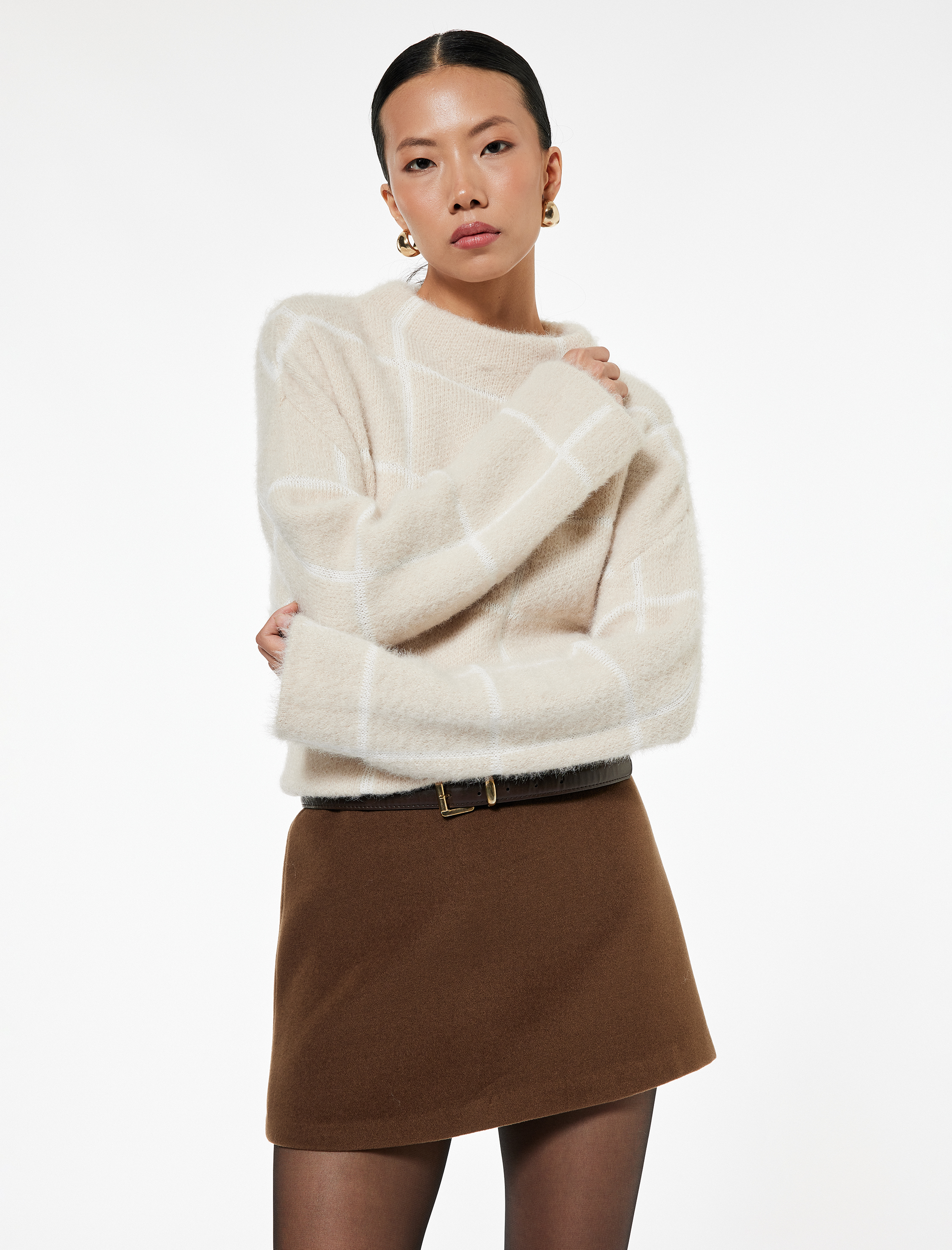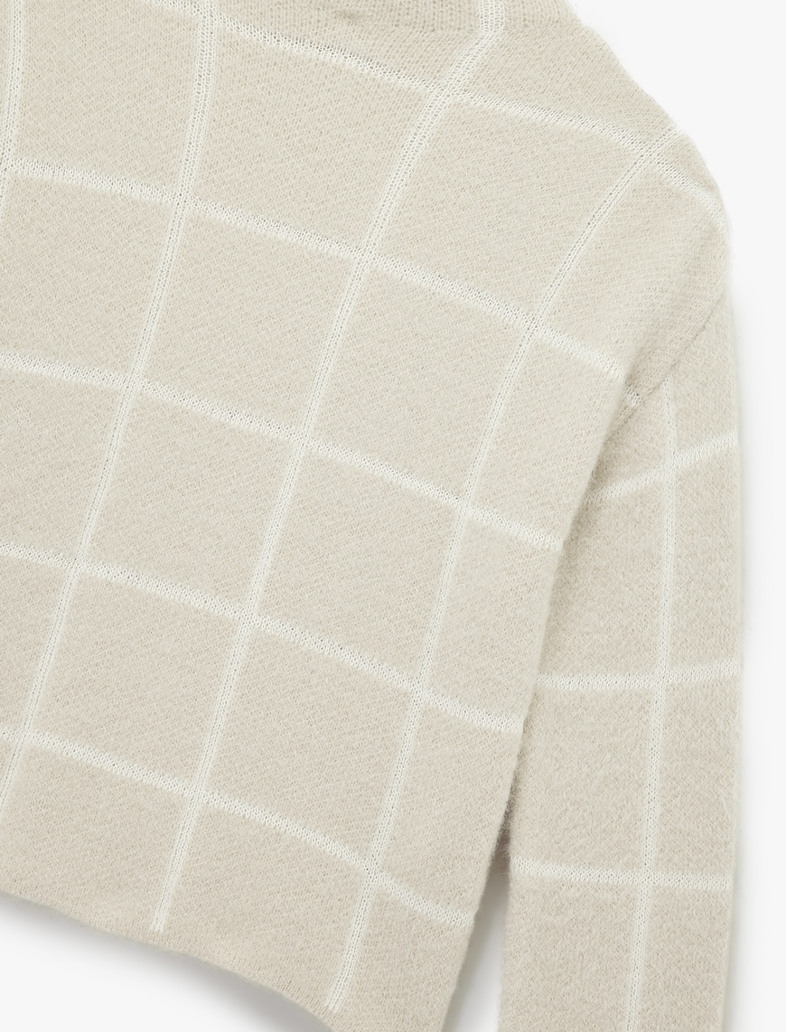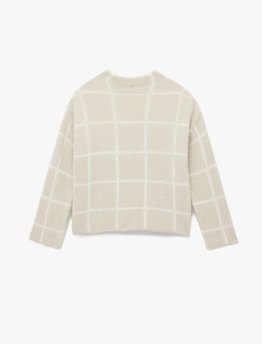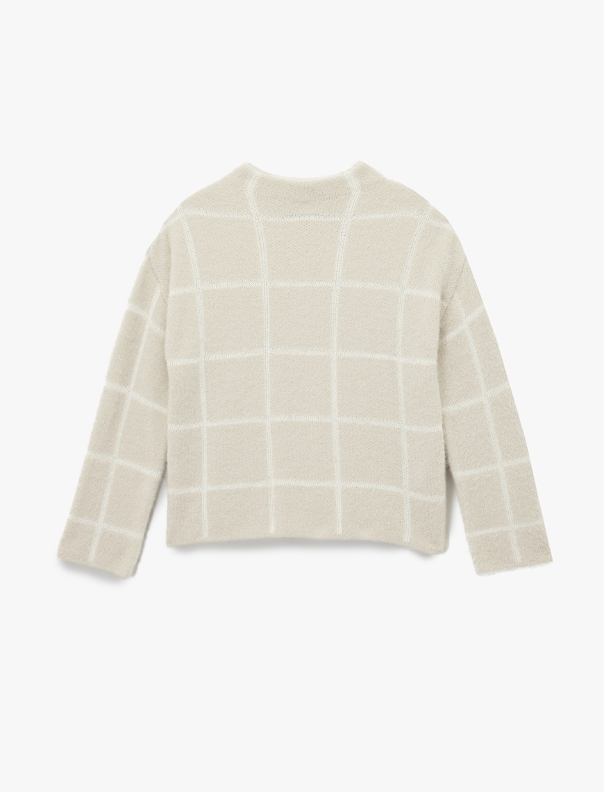 Uzun Kollu Dik Yaka Kareli Triko Peluş Kazak
