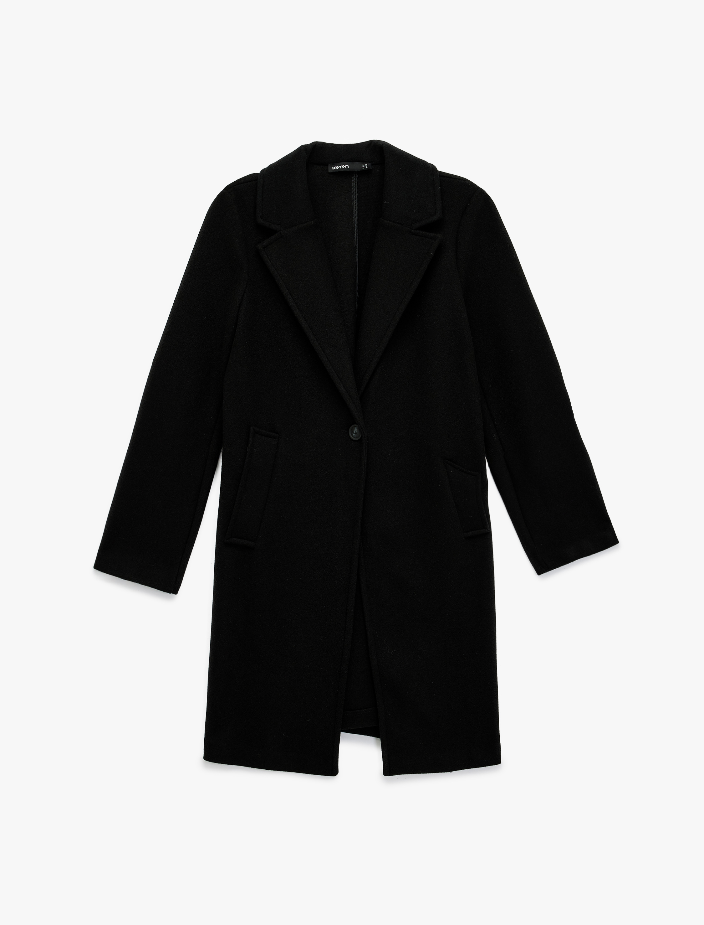 Uzun Kollu Düğmeli Cepli Kruvaze Uzun Kaşe Kaban