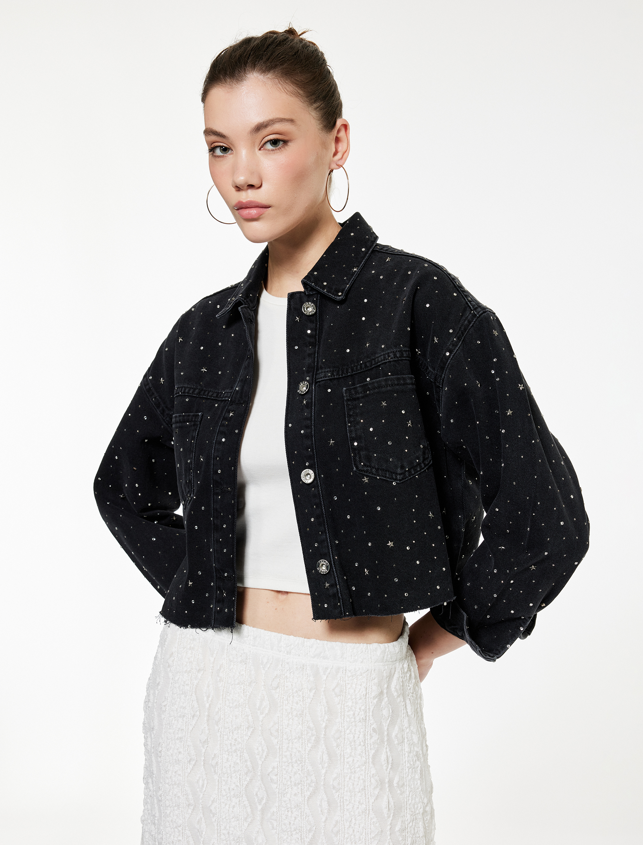 Uzun Kollu Klasik Yaka Cep Detaylı Crop Taşlı Denim Ceket