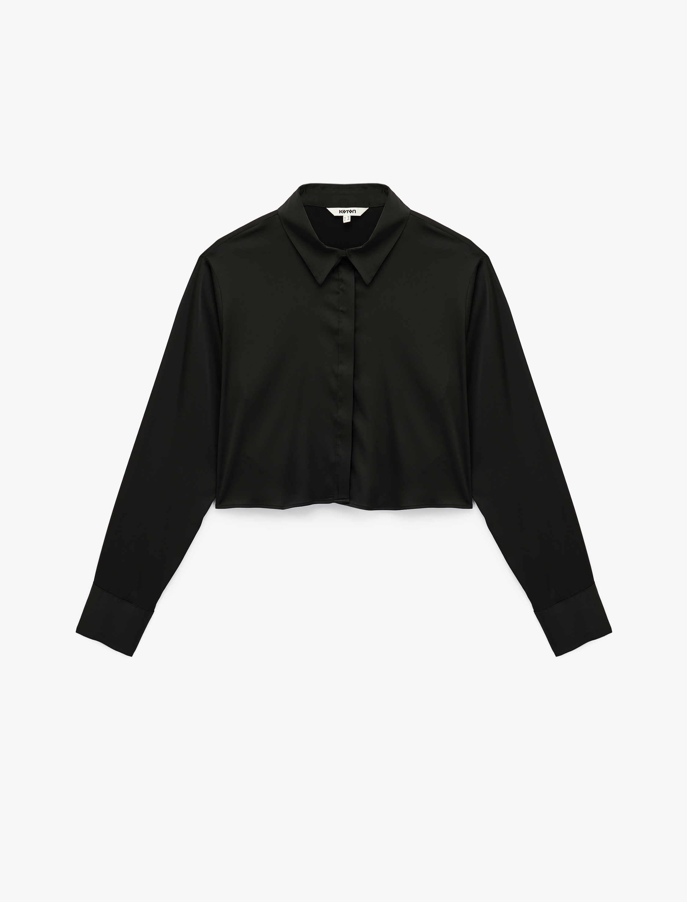 Uzun Kollu Klasik Yaka Crop Saten Gömlek