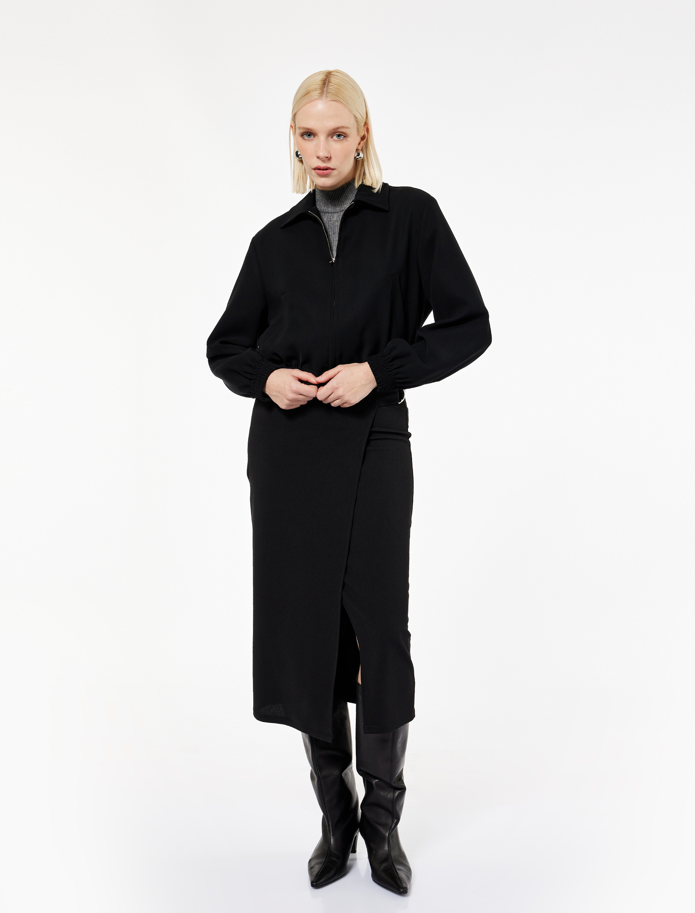 Uzun Kollu Klasik Yaka Fermuarlı Mevsimlik Ceket