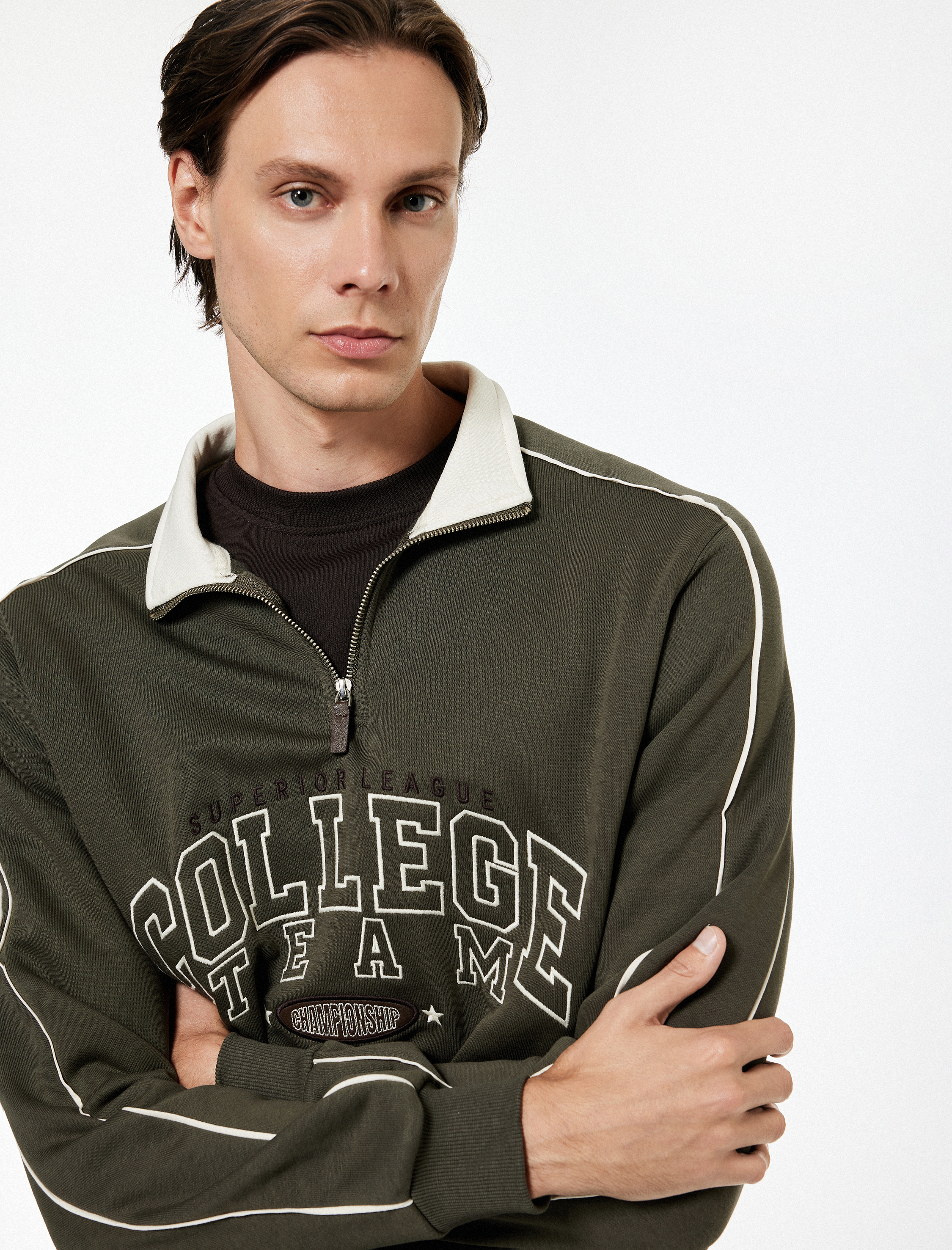 Uzun Kollu Kolej Nakışlı Renk Kontrastlı Şardonlu Yarım Fermuarlı Sweatshirt