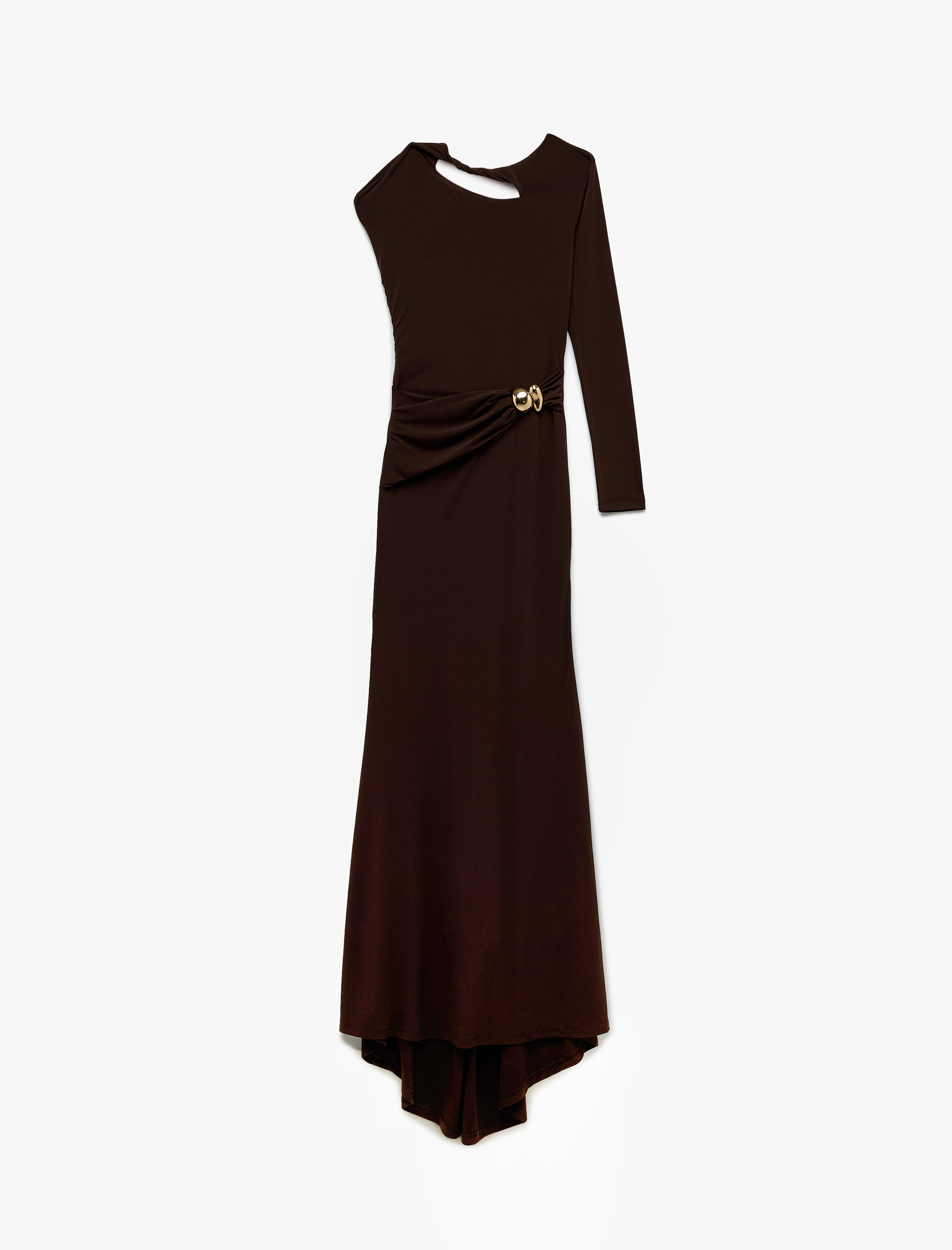Uzun Kollu Metal Aksesuarlı Sırtı Pencere Detaylı Uzun Tek Omuz Elbise