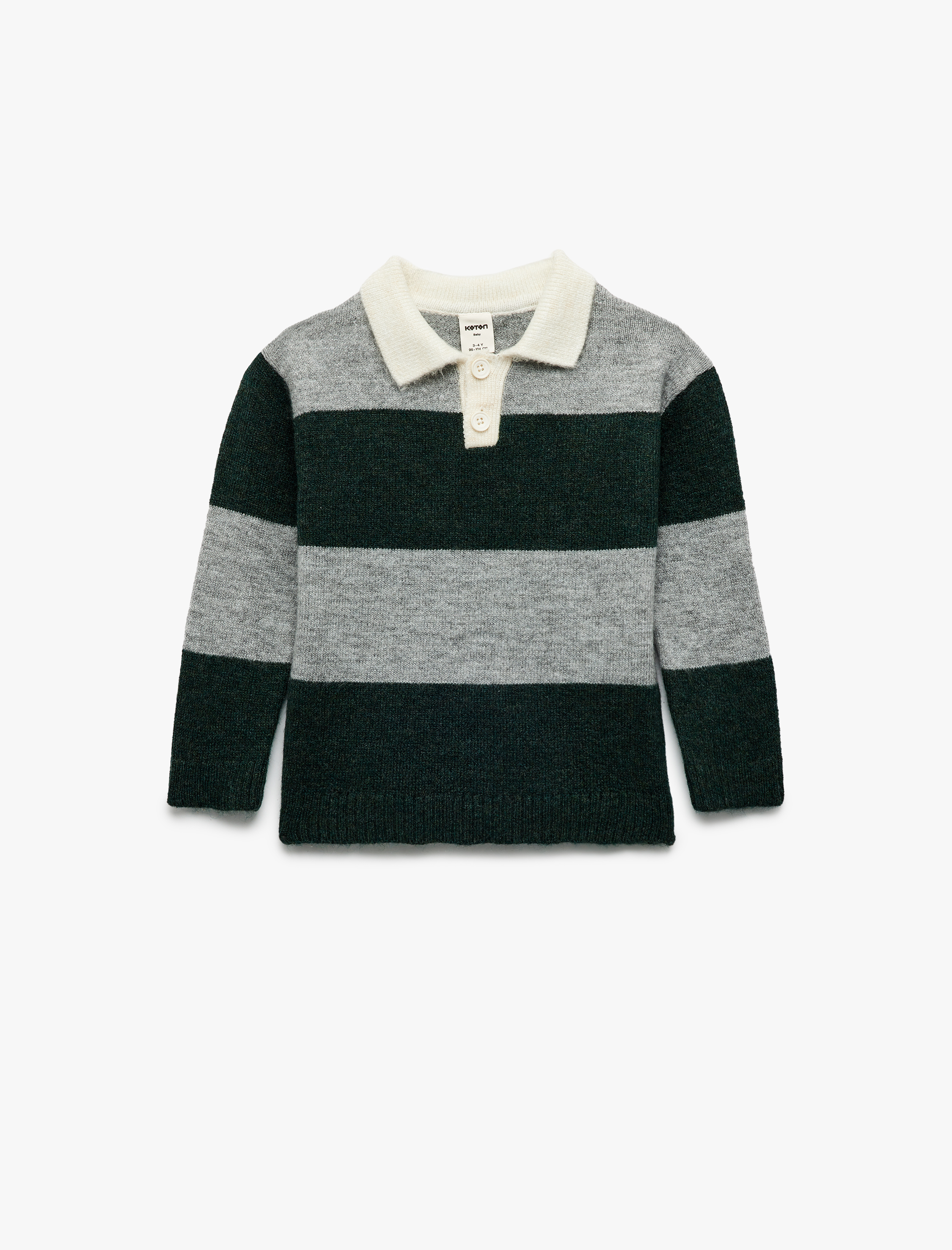 <p><p>Rahat kalıp polo yaka triko kazak, günlük stillere rahatlık katıyor. Uzun kollu tasarımıyla soğuk havalarda sıcak tutuyor. Düğme detayları ve şeritli deseni ile modern bir görünüm sunan bu kazak, hem şıklığı hem de konforu bir araya getiriyor. Miniklerin favori parçalarından biri oluyor.</p></p> <strong>Ürün Özellikleri</strong> <p>Kol Tipi: Uzun Kol<br>Yaka Tipi: Polo Yaka<br>Detay: Düğmeli<br>Fit: Regular<br>Kumaş: %75 Akrilik, %25 Polyester<br>Kullanım Alanı: Günlük Giyim</p> <p><p>Koton erkek bebek koleksiyonu, konfor ve tarzı bir araya getiriyor! Siz de Koton'un eşsiz tasarımlarıyla miniklerin tarzını renklendirin!</p></p> <p>Bebeğiniz bu kıyafet ile güvende! Ürünlerimiz kimyasallara karşı test edilerek, tüm güvenlik kurallarına uygun olarak üretilir. Ürünlerimizde sağlığa zararlı boyalar ve ağır metaller, tehlikeli yutulabilecek küçük ve keskin parçalar, kordon ve bağcıklar bulunmamaktadır.</p>