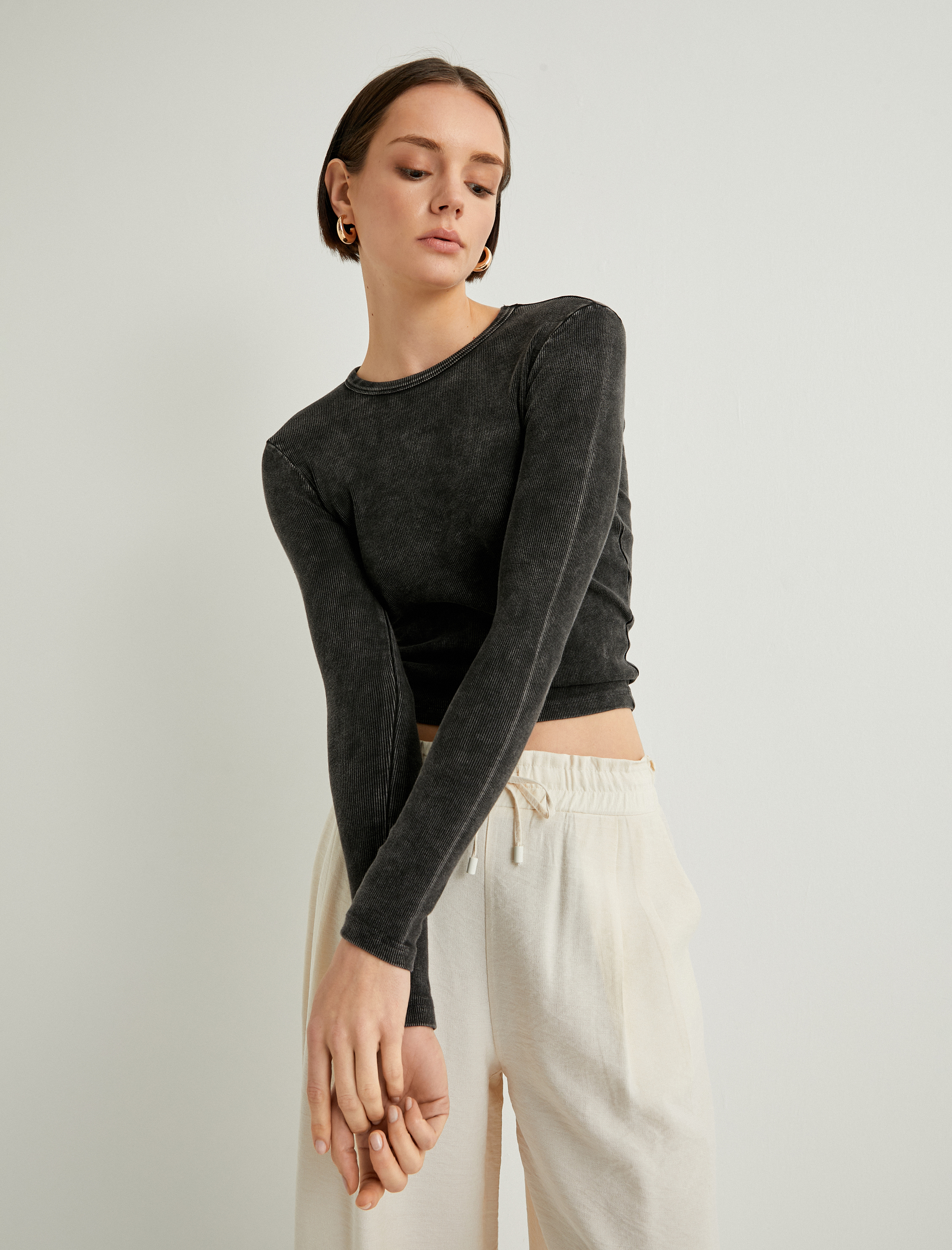 Uzun Kollu Tişört Bisiklet Yaka Fitilli Soluk Efektili Pamuklu