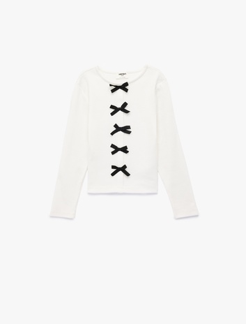 Kız Çocuk Fiyonk Taş Detaylı Uzun Kollu Bisiklet Yaka Pamuklu Tişört