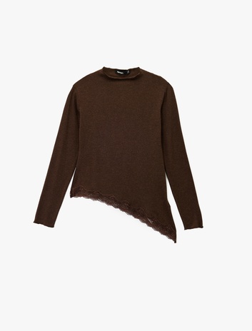 Regular Fit Uzun Kollu Asimetrik Bisiklet Yaka Dantelli Tişört
