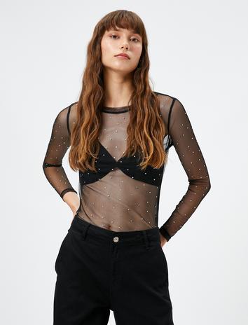 Uzun Kollu Yuvarlak Yaka Slim Fit Taşlı Tül Transparan Tişört
