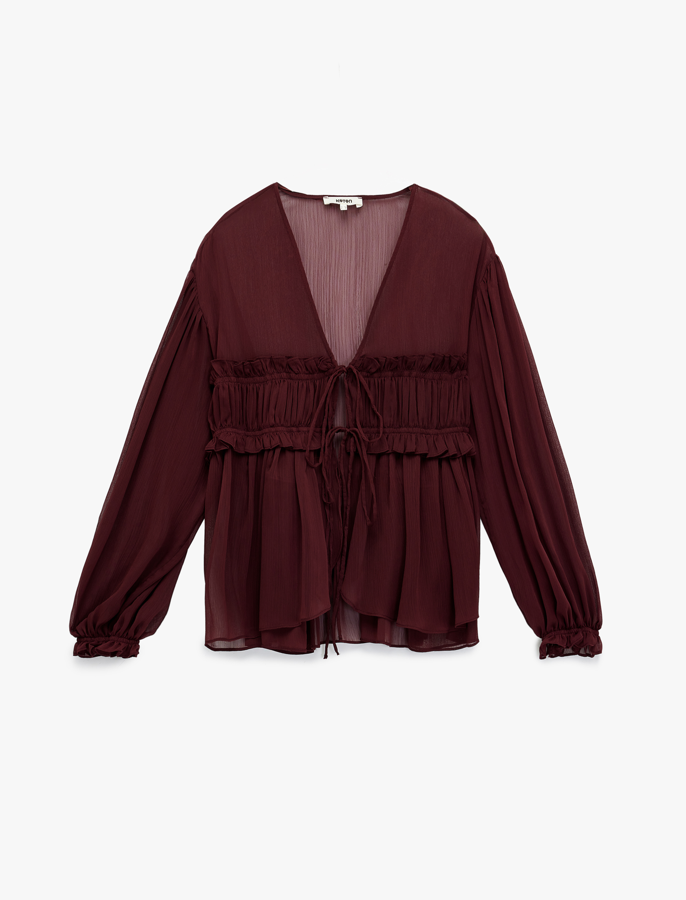 { "id": "8684846815664", "name": "Uzun Kollu Transparan V Yaka Fırfır Detaylı Önden Bağlamalı Tül Bluz", "taxonomy":["CITY FASHION","CITY FASHION","WOMEN","WOVEN TOPS","BLOUSE LS"], "currency": "TRY", "unit_price": 1299.99 , "unit_sale_price": 1299.99 , "url": "https://www.koton.com/uzun-kollu-transparan-v-yaka-firfir-detayli-onden-baglamali-tul-bluz-bordo-4104453/", "stock": 10, "color": "BORDO", "size": "36", "combine": "", "product_image_url": "https://ktnimg2.mncdn.com/products/2025/10/17/3143781/ceac2e58-be63-4917-905d-88fe9491df6b.jpg" }