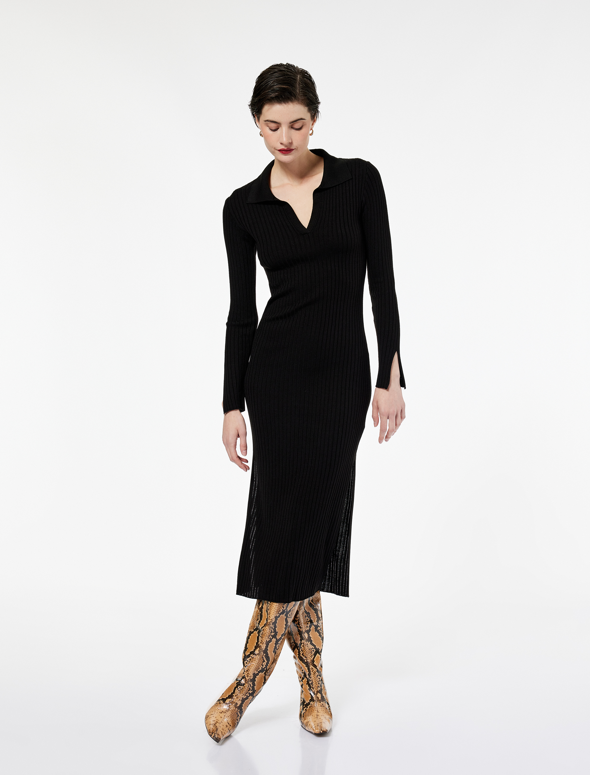 Uzun Kollu Yırtmaçlı Polo Yaka Uzun Triko Kalem Elbise