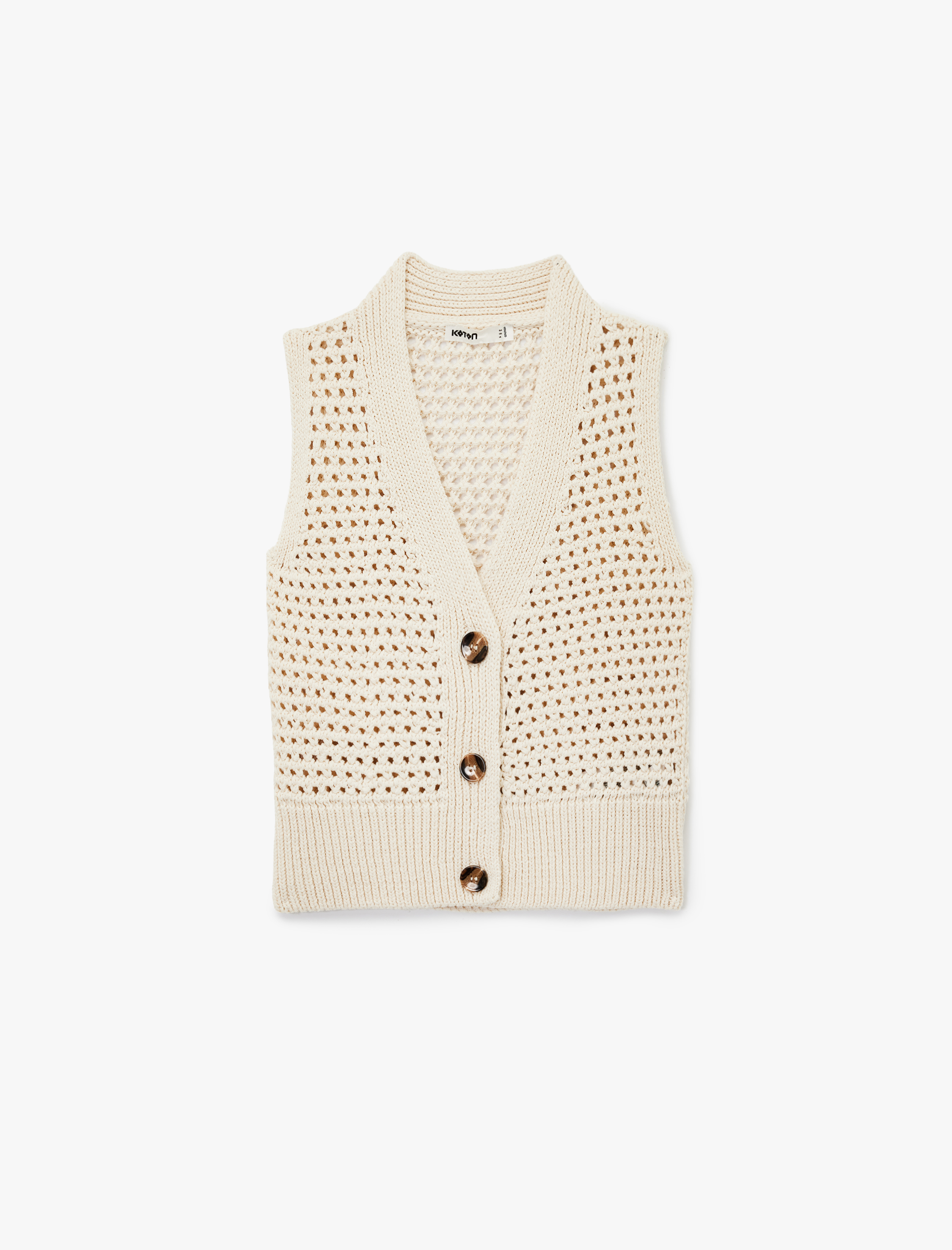 V Yaka Düğmeli Ajurlu Triko Yelek
