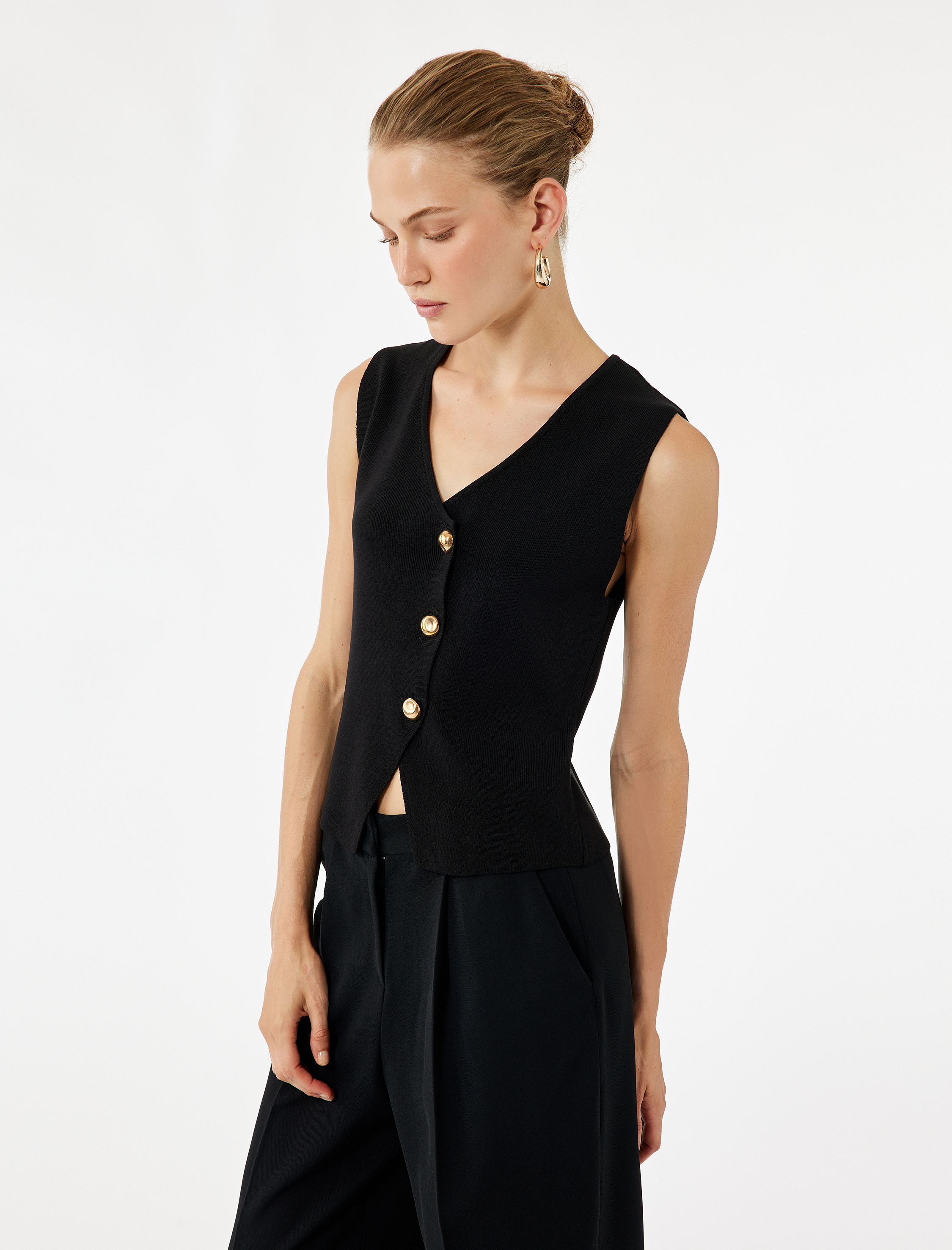 V Yaka Kolsuz Gold Düğmeli Triko Yelek