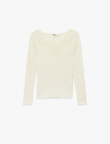 Slim Fit Uzun İspanyol Kollu V Yaka Dantel Tişört