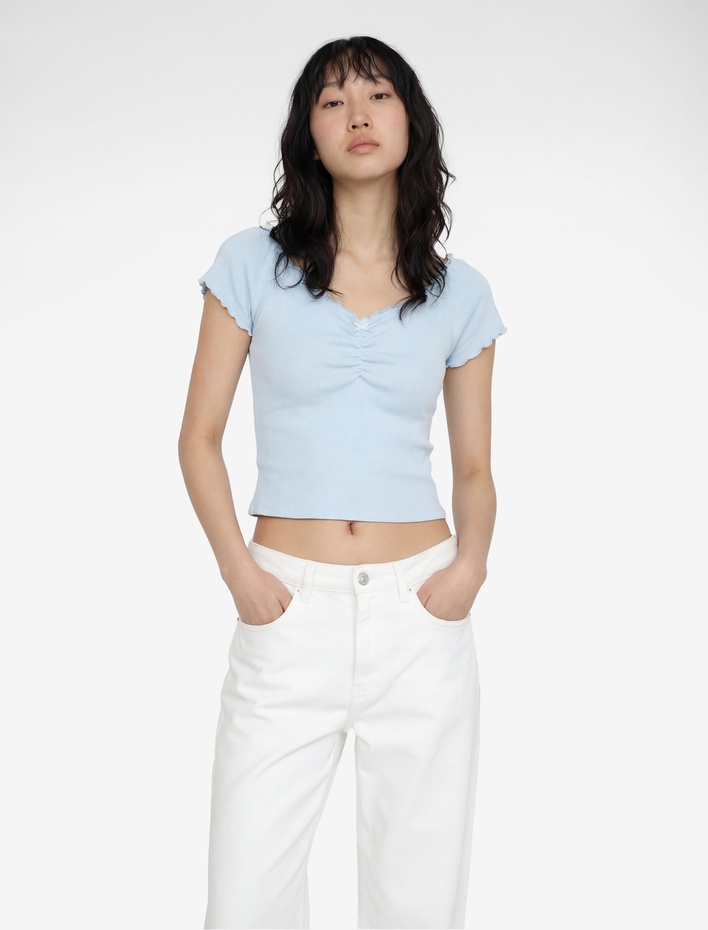 Büzgülü Dantel Detaylı Slim Fit V Yaka Kısa Kollu Tişört Sepete Ekle