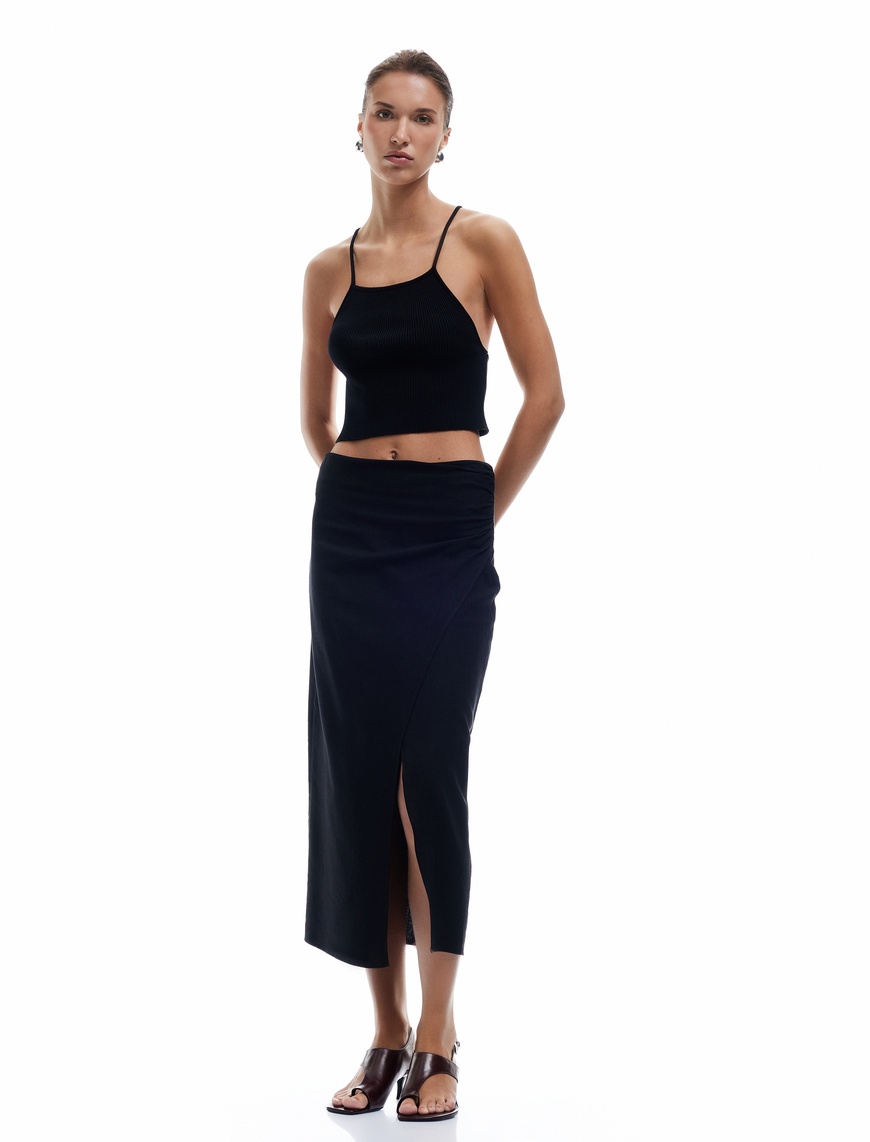Viskon Karışımlı Asimetrik Kesim Drapeli Yırtmaçlı Kruvaze Midi Kalem Etek