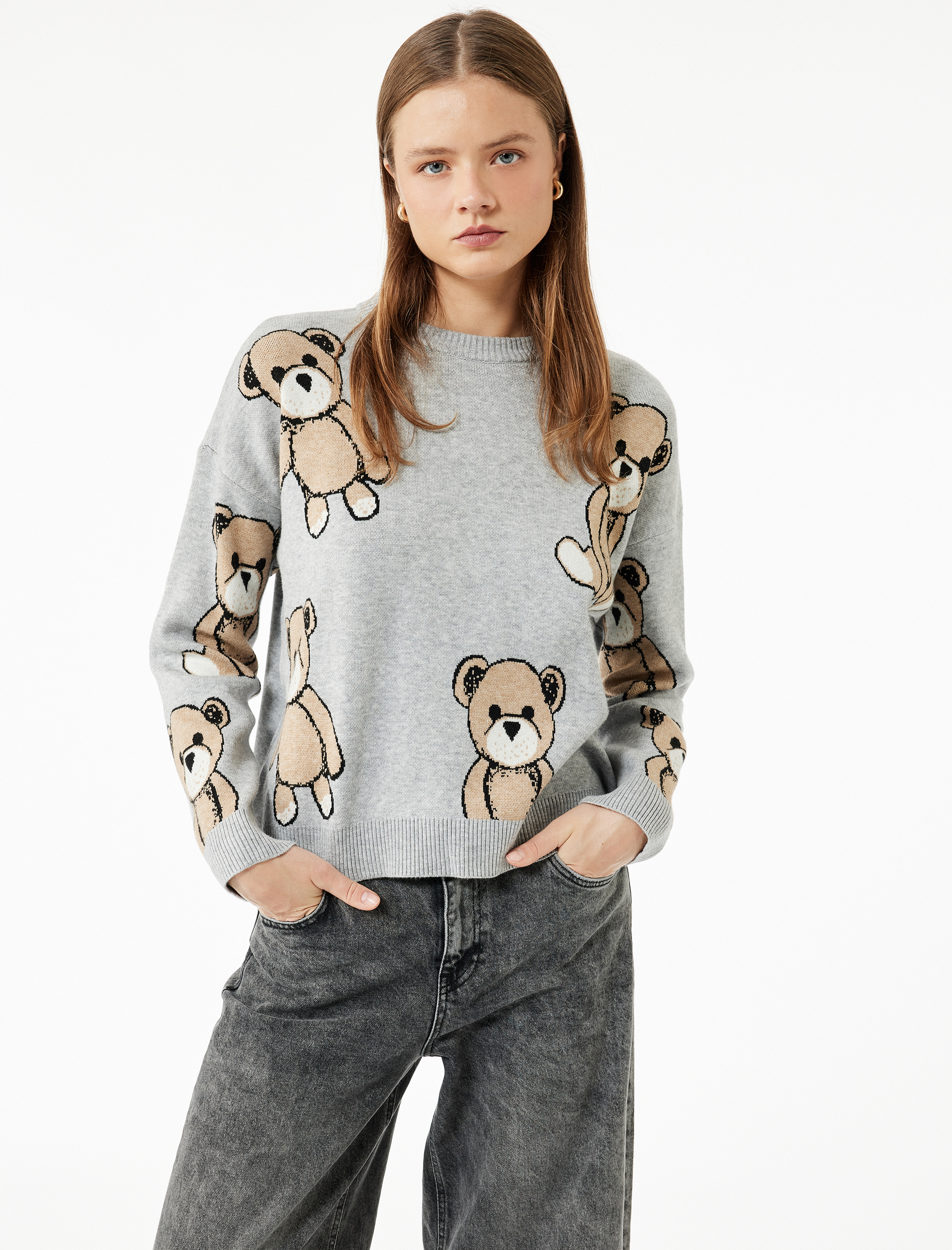 Viskon Karışımlı Uzun Kollu Bisiklet Yaka Ayıcık Desenli Triko Kazak