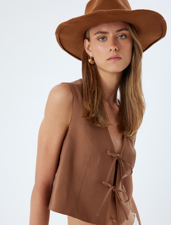 Fiyonklu Önü Bağcıklı Crop Yelek V Yaka Modal Kumaş