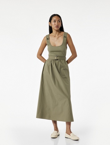 İki Farklı Kumaş Kullanımlı A Kesim Kemerli Kalın Askılı Midi Boy Poplin Elbise Sepete Ekle