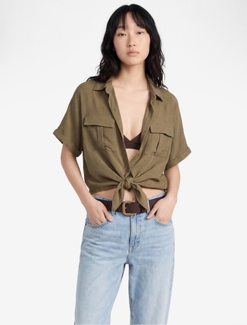 Aerobin Kumaş Rahat Kalıp Kısa Kollu Bağlama Detaylı Cepli Yazlık Gömlek