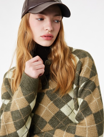 Kısa Kollu Bisiklet Yaka Baklava Desenli Triko Kazak