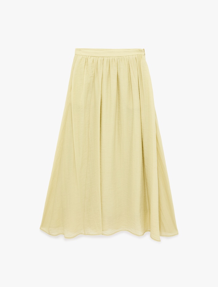 Viskon Kumaş Pile Detaylı Cepli Çan Kesim Midi Etek Sepete Ekle