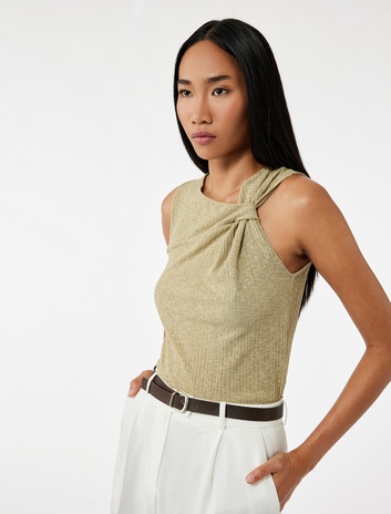 Asimetrik Yaka Düğüm Detaylı Dokulu Kolsuz Tişört Sepete Ekle