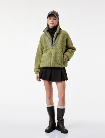 Uzun Kollu Cepli Dik Yaka Fermuarlı Peluş Ceket Sepete Ekle
