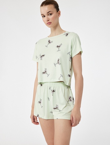 Köpek Baskılı Kısa Kollu Bisiklet Yaka Şortlu Pijama Takımı