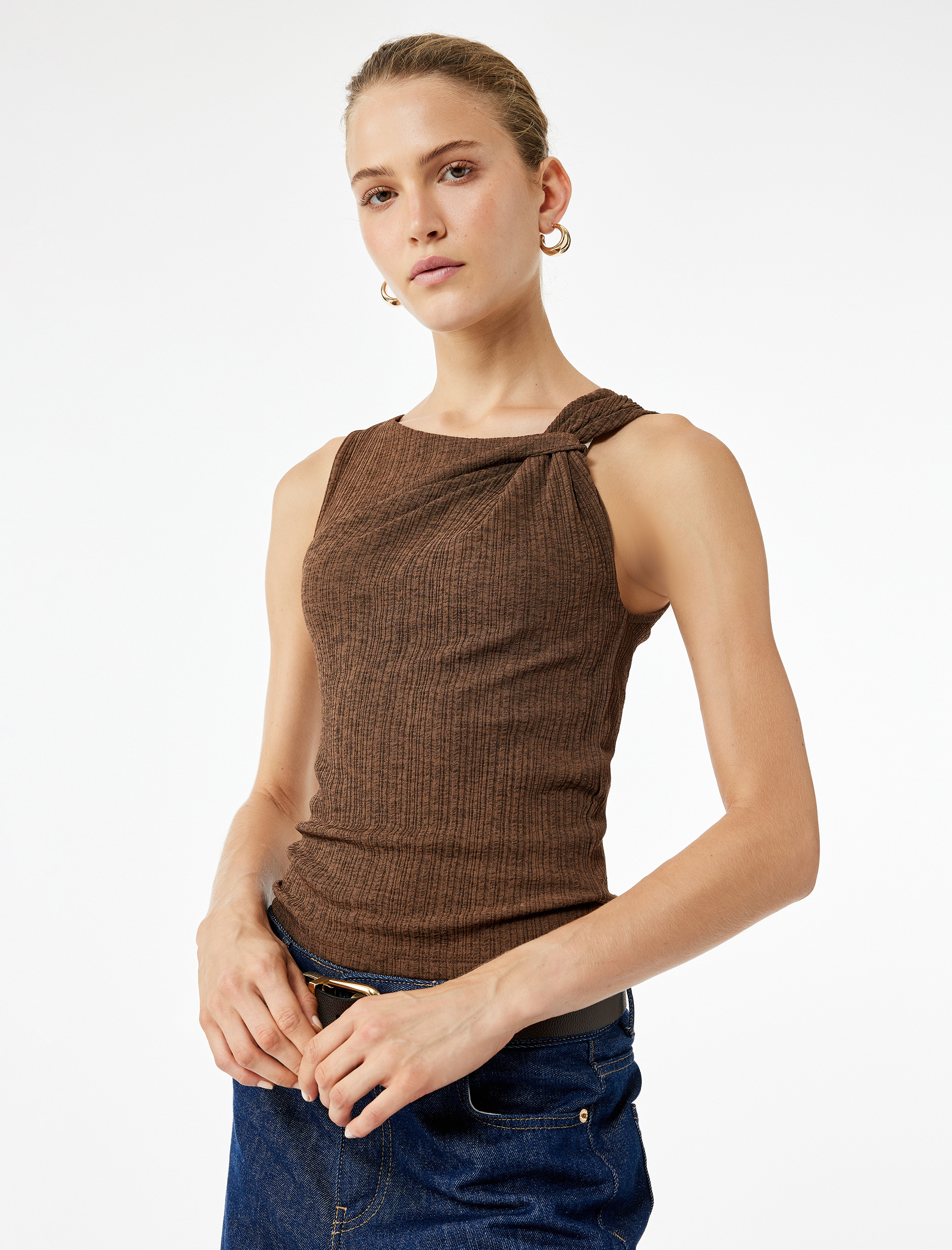 Yarı Transparan Asimetrik Düğüm Detaylı Kolsuz Bluz