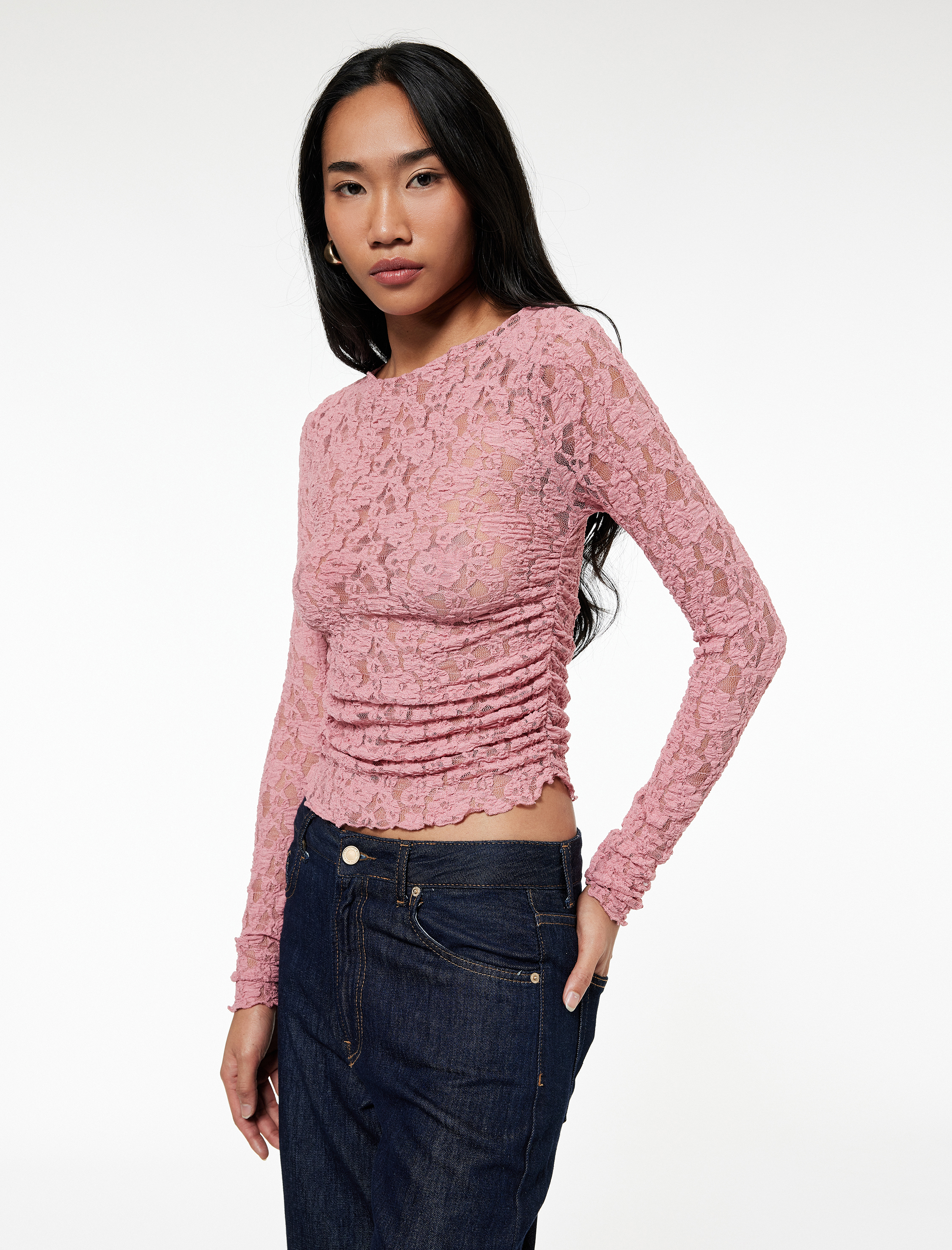Yarı Transparan Uzun Kollu Kayık Yaka Dantel Bluz