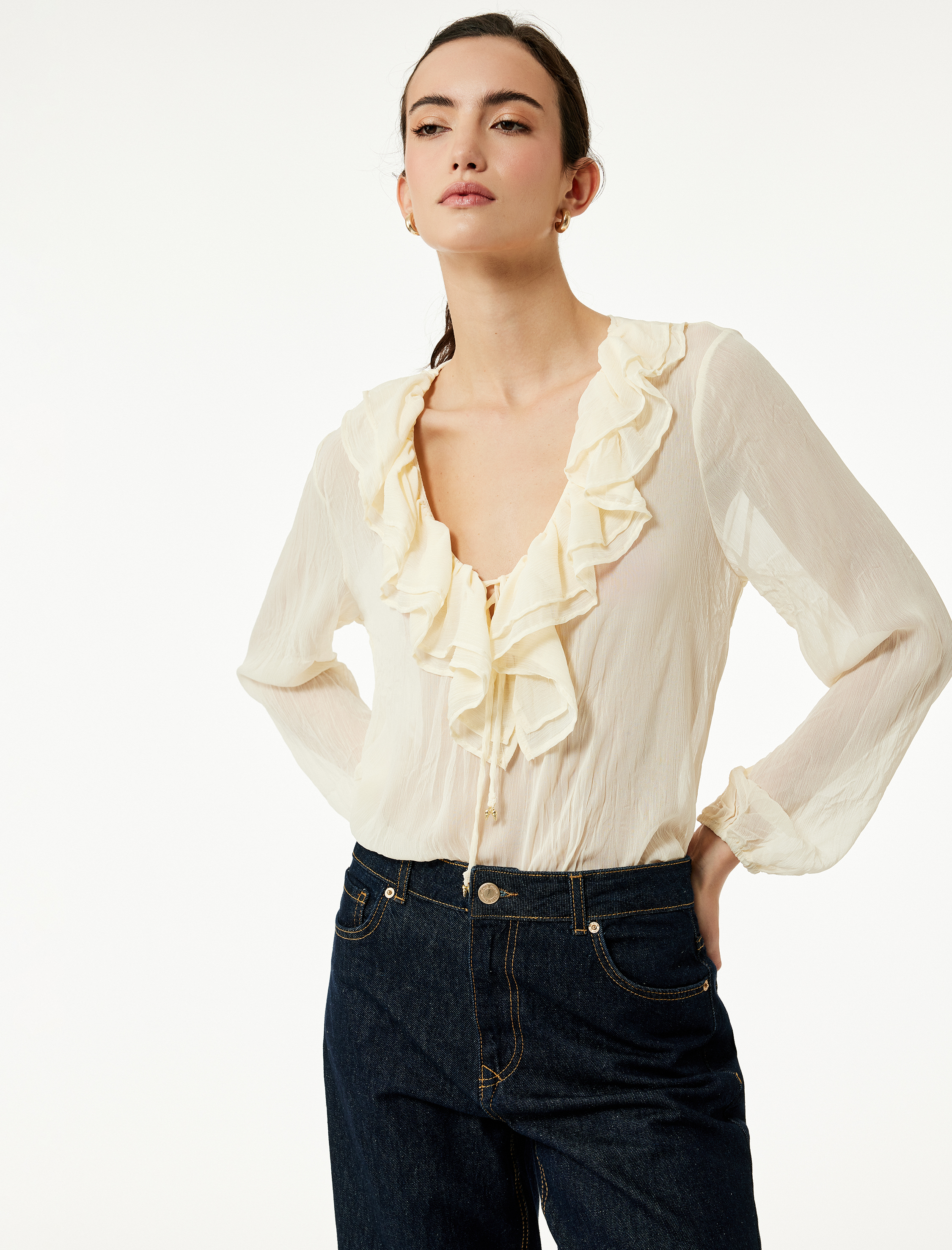 Yarı Transparan Uzun Kollu V Yaka Fırfırlı Şifon Bluz