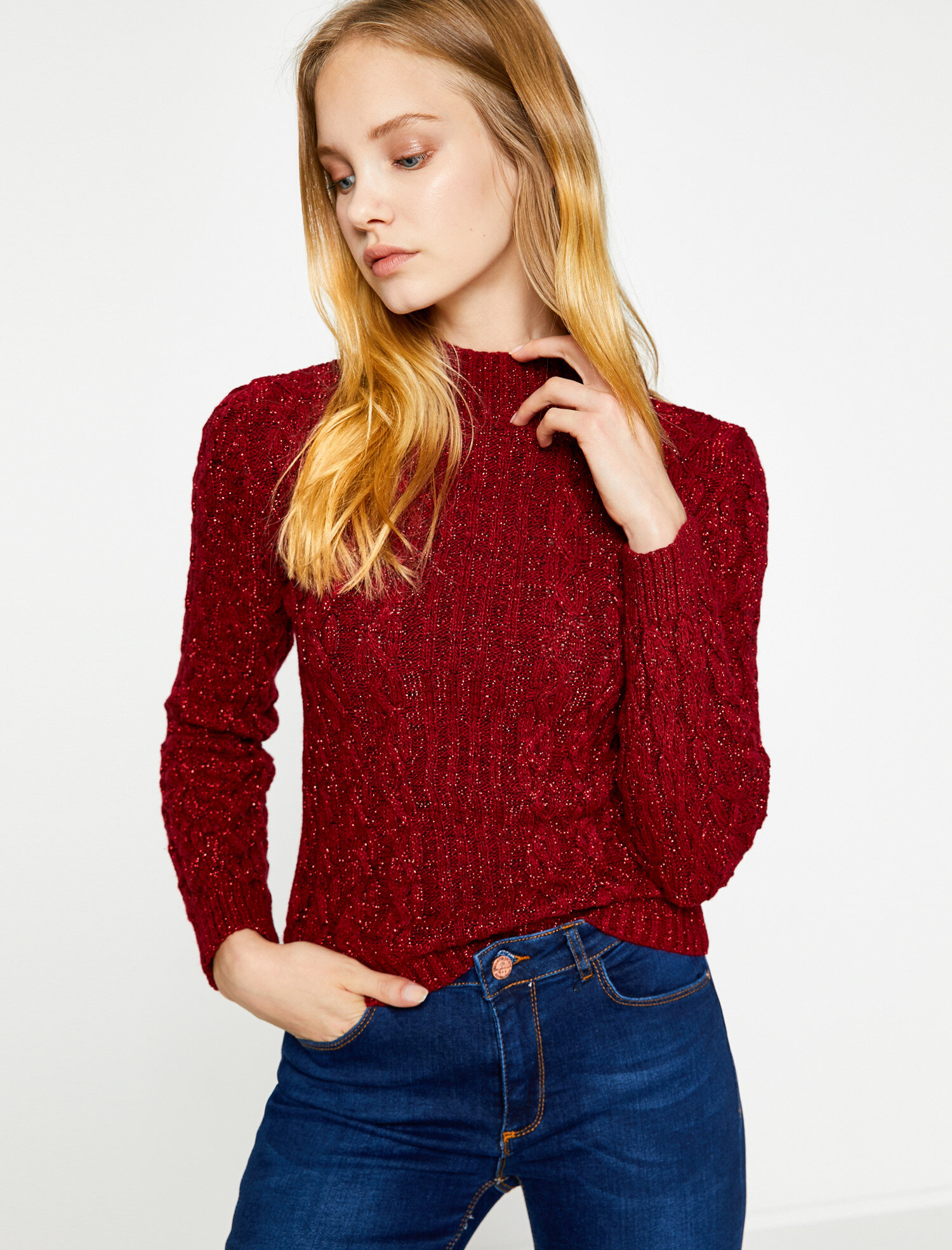 Yarım balıkçı yaka, simli, örgü detaylı kazak.