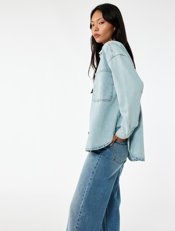 Pamuklu Düğmeli Rahat Kalıp Klasik Yaka Cep Detaylı Denim Gömlek