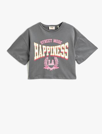 Crop Tişört Pamuklu Kısa Kollu Bisiklet Yaka Baskılı