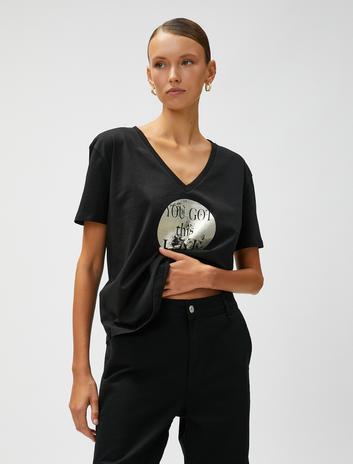 V Yaka Tişört Parlak Baskılı Pamuklu