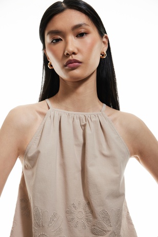 Pamuklu Floral Dokulu Fistolu Brodeli Halter Yaka Askılı Bluz