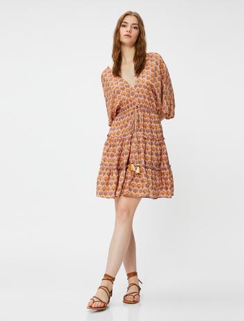 Etnik Baskılı Katlı Mini Elbise V Yaka