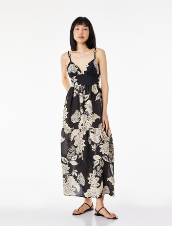 Keten Karışımlı İnce Askılı Nakışlı Çiçekli Uzun Elbise Sepete Ekle