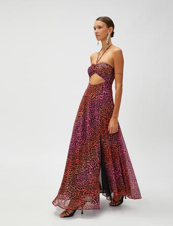 Boynu Metal Bağlamalı Leopar Desenli Pencere Detaylı Elbise