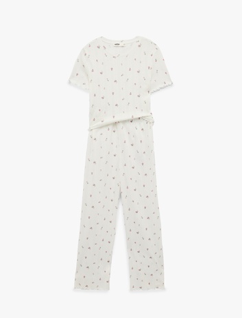 Pamuklu Kısa Kollu Bisiklet Yaka Çiçek Desenli Pijama Takımı - 2'li Set Sepete Ekle