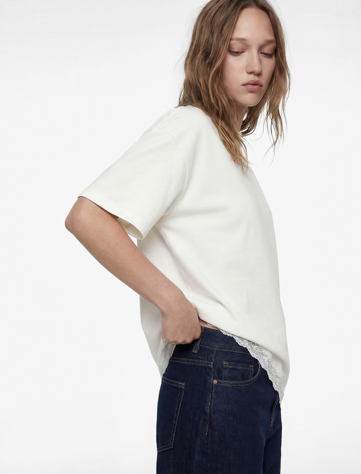 Kısa Kollu Bisiklet Yaka Dantel Detaylı Rahat Kalıp Tişört Sepete Ekle