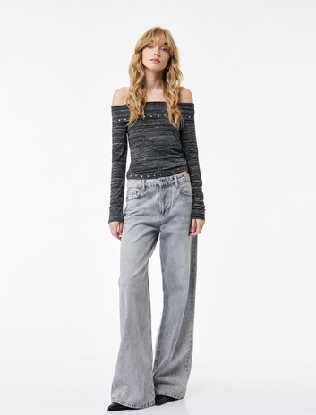 Koton X Sibil Çetinkaya - Uzun Kollu Zımba Detaylı Omzu Açık Bluz