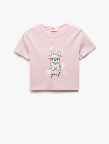 Kız Çocuk Köpek Baskılı Pamuklu Bisiklet Yaka Kısa Kollu Tişört