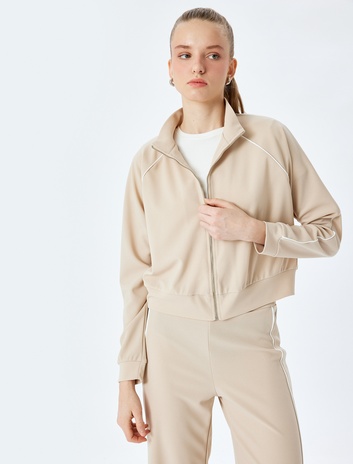 Dik Yaka Uzun Kollu Fermuarlı Biyeli Sweatshirt