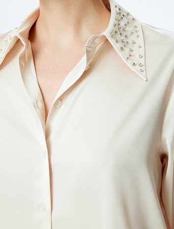 Uzun Kollu Klasik Yaka Taşlı Saten Gömlek