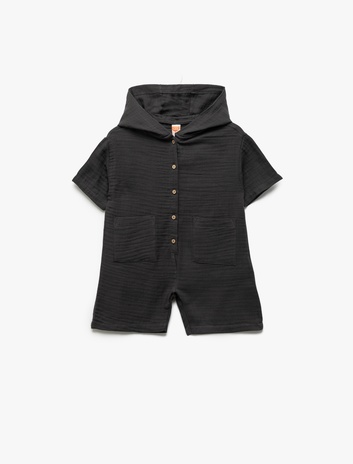 Pamuklu Kısa Kollu Düğmeli Müslin Kapşonlu Salopet Tulum Sepete Ekle