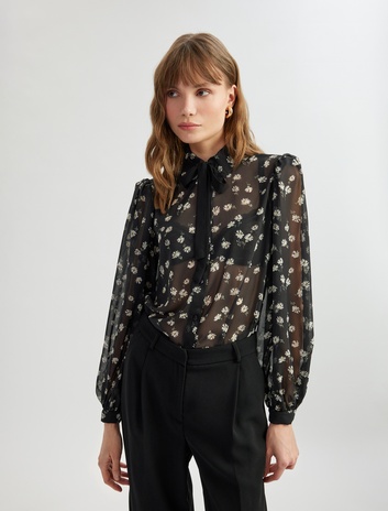 Yarı Transparan Uzun Balon Kollu Bağlama Detaylı Çiçekli Şifon Gömlek